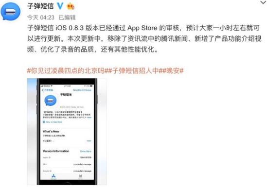8月29日消息,凌晨4點(diǎn)子彈短信官方微博發(fā)文:子彈短信iOS0.8.3版本已經(jīng)通過(guò)AppStore的審核。本次更新中,移除了資訊流中的騰訊新聞、新增了產(chǎn)品功能介紹視頻、優(yōu)化了錄音的品質(zhì),還有其他性能優(yōu)化。