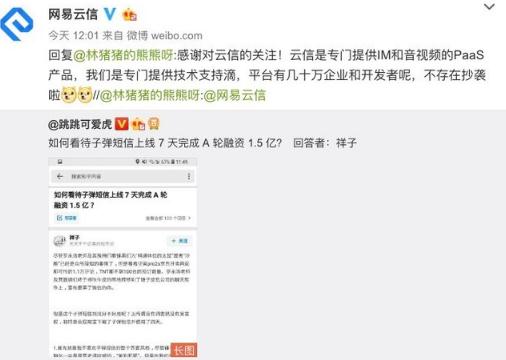 然而網(wǎng)易云信官方微博卻直接表示:“感謝對云信的關(guān)注!云信是專(zhuān)門(mén)提供IM和音視頻的PaaS產(chǎn)品,我們是專(zhuān)門(mén)提供技術(shù)支持滴,平臺有幾十萬(wàn)企業(yè)和開(kāi)發(fā)者呢,不存在抄襲啦”