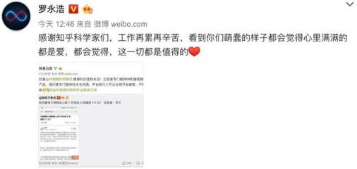 老羅隨后發(fā)博:“感謝知乎科學(xué)家們,工作再累再辛苦,看到你們萌蠢的樣子都會(huì )覺(jué)得心里滿(mǎn)滿(mǎn)的都是愛(ài),都會(huì )覺(jué)得,這一切都是值得的”