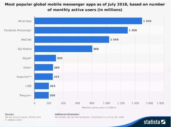 在海外市場(chǎng),微信雖未如國內一般與 QQ 成為社交霸主,但是也占據了相當大的份額。