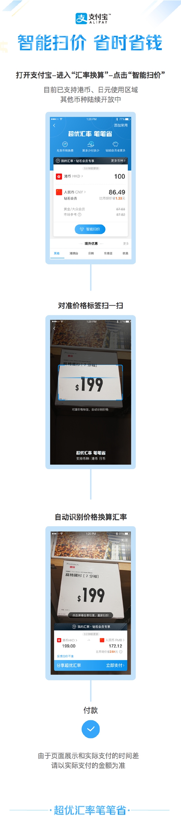 為了方便出境游客,支付寶里新推了“智能掃價(jià)”功能,從支付寶-匯率換算進(jìn)入,打開(kāi)“智能掃價(jià)”,掃一掃商品價(jià)格標簽,就能自動(dòng)計算以支付寶付款的價(jià)格結果。