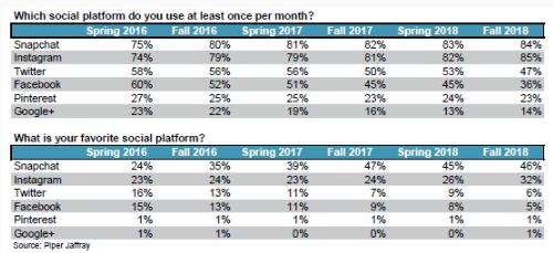 派杰發(fā)現,85% 接受調查的青少年每月至少使用 Facebook 旗下的這款社交媒體平臺一次,這個(gè)比例打敗了使用率為 84% 的 Snapchat,后者為社交媒體行業(yè)的長(cháng)期領(lǐng)導者。Snapchat 的優(yōu)勢在喪失,其母公司 Snap 的股價(jià) 10 月 11 日達到了前所未有的低點(diǎn) 6.46 美元一股,這比該公司去年 IPO 價(jià)格 17 美元一股跌幅超過(guò)了 60%。