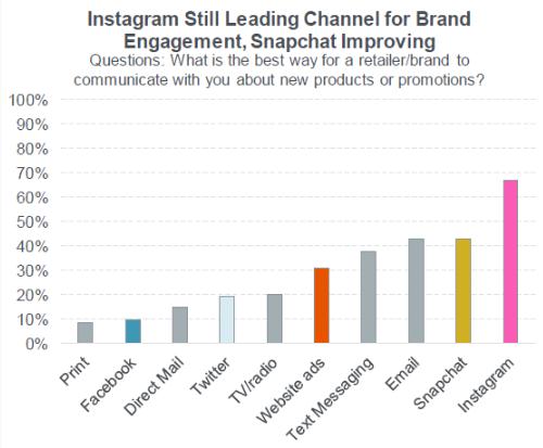 Instagram 鞏固了其領(lǐng)先優(yōu)勢,近 70% 的青少年表示他們更喜歡品牌就新品通過(guò) Instagram 與他們聯(lián)系。 Snapchat 在這項調查中排在電子郵件之前排名第二,比例僅超過(guò) 40%。