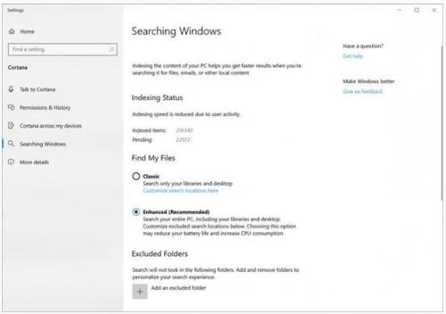 用戶(hù)啟用增強搜索模式后,Windows 10 將索引的不僅僅是放置在庫中的文件。這意味著(zhù)系統會(huì )索引所有文件和文件夾以創(chuàng )建數據映射。索引過(guò)程可能需要 5 分鐘或更長(cháng)時(shí)間,因為它完全取決于本地驅動(dòng)器上的文件數。但是,用戶(hù)可以從索引中排除路徑或位置以加快進(jìn)程。