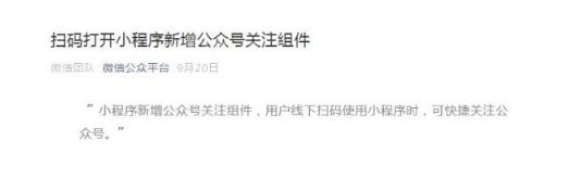 “小程序新增公眾號關(guān)注組件,用戶(hù)線(xiàn)下掃碼使用小程序時(shí),可快捷關(guān)注公眾號。”