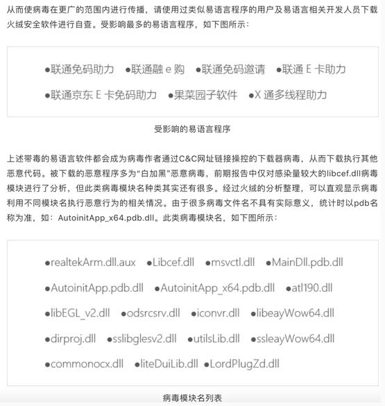 在接受虎嗅采訪(fǎng)時(shí),騰訊安全實(shí)驗室負責人 TK 分析認為:“從現有的報告來(lái)看,這跟當年的熊貓燒香差不多。你說(shuō)為什么這么傳播廣,寫(xiě)易語(yǔ)言程序的人,他寫(xiě)的程序本身是會(huì )被殺毒軟件干掉的,黑產(chǎn)或灰產(chǎn)的程序本身就是這些人寫(xiě)的,會(huì )被很多殺毒軟件查殺,所以他們(被感染的這些)自身也不會(huì )裝這些殺毒軟件。”所以這些人開(kāi)發(fā)的薅羊毛軟件被感染了病毒而不自知。