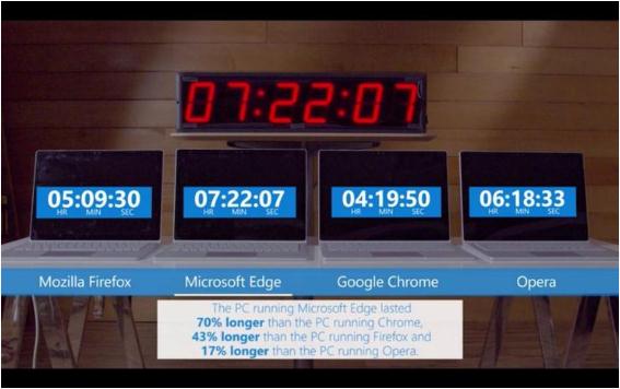 過(guò)去兩三年,為了推動(dòng)用戶(hù)使用 Edge 瀏覽器,微軟會(huì )在 Windows 10 系統中通過(guò)彈窗等各種方式來(lái)揶揄 Chrome 瀏覽器。甚至在 2016 年 6 月,微軟甚至專(zhuān)門(mén)發(fā)布了一篇報告,將運行在 Windows 10 操作系統上的 Microsoft Edge,Chrome,Firefox 和 Opera 四款瀏覽器的電量損耗情況進(jìn)行了對比測試,而測試結果(不出意外地)表明:Microsoft Edge 比 Chrome 等其他瀏覽器更加省電。