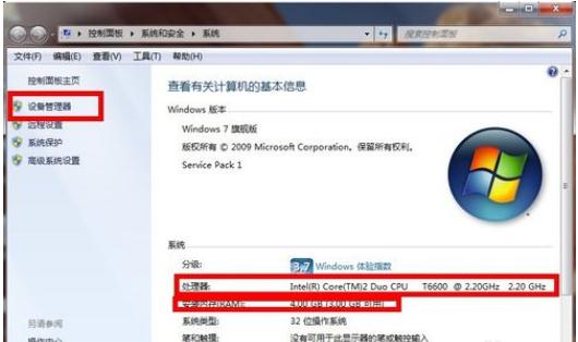 在屬性選項卡里可看到基本的CPU及內存配置,更詳細的配置資料點(diǎn)擊選擇左側的設備管理器!