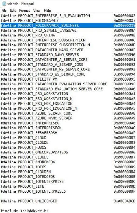 開(kāi)發(fā)人員在系統定義中發(fā)現了 PRODUCT_HOLOGRAPHIC_BUSINESS,它與 PRODUCT_HOLOGRAPHIC 并列。這是兩個(gè)全新 Windows 10 SKU。