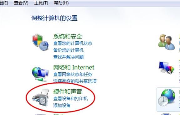 在彈出的對話(huà)框里點(diǎn)擊“硬件和聲音”選項進(jìn)入下級頁(yè)面;