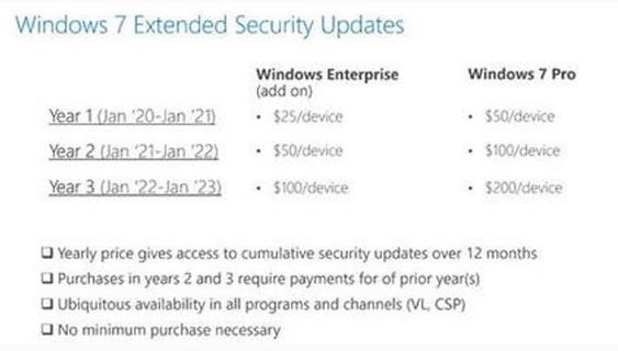 隨著(zhù)時(shí)間的推移,價(jià)格每年按照翻一番的速度調整。換言之,2022年到2023年需要100美元/設備或者200美元/設備(Win7專(zhuān)業(yè)版)。