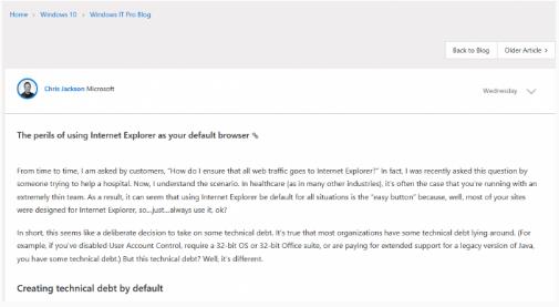 四年前微軟已經(jīng)放棄InternetExplorer品牌,在Windows10平臺上啟用全新的Edge瀏覽器試圖挑戰Chrome和Firefox的市場(chǎng)地位。盡管出于業(yè)務(wù)兼容性等方面的考量部分企業(yè)仍在IE瀏覽器,但它臃腫、過(guò)時(shí)的代碼并不支持諸多Web新標準。隸屬于微軟Windows部門(mén)的網(wǎng)絡(luò )安全專(zhuān)家克里斯·杰克遜(ChrisJackson)近日發(fā)表了名為“使用IE作為默認瀏覽器的風(fēng)險”文章,推薦更多用戶(hù)升級至Edge上。