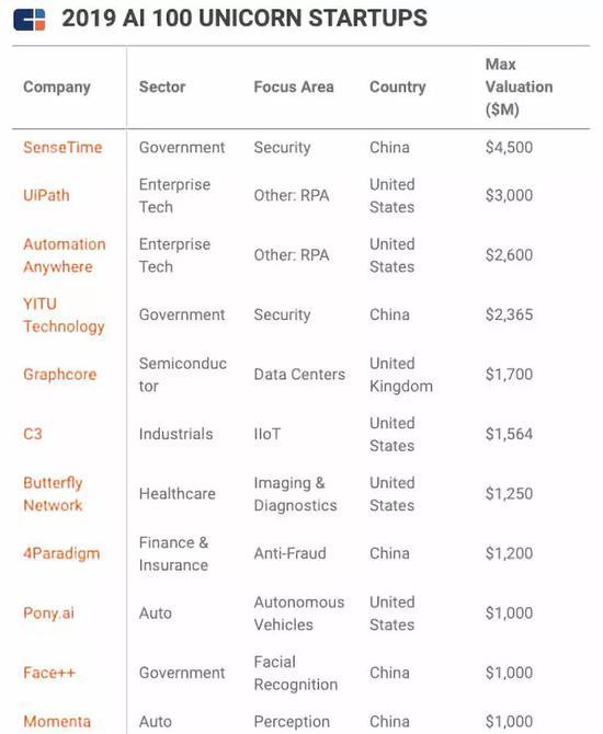 100家公司里有11家獨角獸公司,其中有5家來(lái)自中國,分別是商湯(估值45億美元)、依圖(估值23.65億美元)、第四范式(估值12億美元)、曠視(估值10億美元)、Momenta(估值10億美元),另外還有一家小馬智行(Pony.ai)(估值10億美元)因總部設在美國,故被列為美國公司,但聯(lián)合創(chuàng )始人彭軍、樓天城均是來(lái)自中國,因此,可以說(shuō)有超過(guò)半數的獨角獸公司來(lái)自中國,無(wú)疑是獨角獸的發(fā)源地。