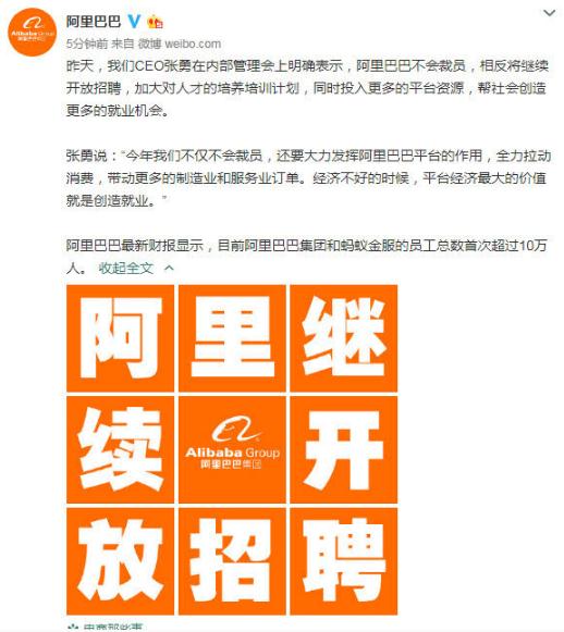2 月 22 日消息,據阿里巴巴官方微博透露,昨日,阿里巴巴集團 CEO 張勇在內部管理會(huì )上明確表示,阿里巴巴不會(huì )裁員,相反將繼續開(kāi)放招聘,加大對人才的培養培訓計劃,同時(shí)投入更多的平臺資源,幫社會(huì )創(chuàng )造更多的就業(yè)機會(huì )。