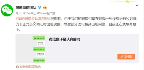 針對此情況,騰訊微信團隊官方微博發(fā)布聲明稱(chēng):“這是由于我們的翻譯引擎在翻譯一些沒(méi)有進(jìn)行過(guò)訓練的非正式英文詞匯時(shí)出現誤翻,導致部分語(yǔ)句翻譯出現問(wèn)題,目前正在緊急修復中。”