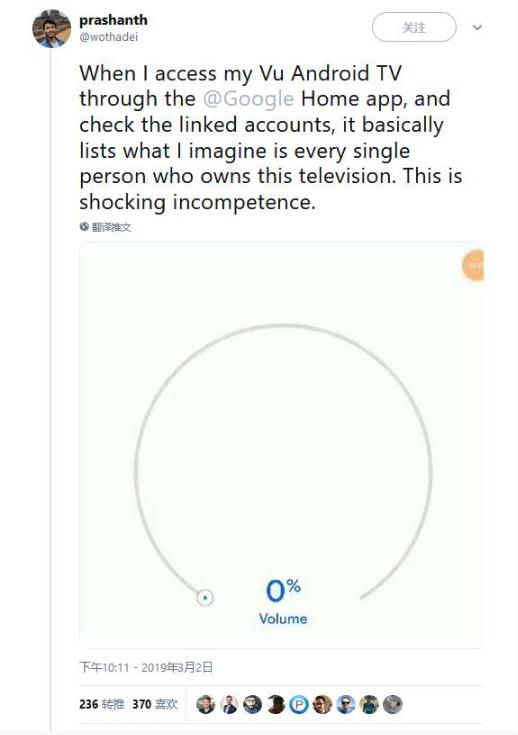 Prashanth 表示他嘗試通過(guò) Google Home 應用程序在 Vu Android TV 上訪(fǎng)問(wèn)捆綁的賬號時(shí)發(fā)現這個(gè)問(wèn)題的。隨后另外一名推特用戶(hù) Aarjith Nandakumar 也報告使用 iFFalcon Android TV 時(shí)候重現了這個(gè)問(wèn)題。Vu 和 iFFalcon 目前并沒(méi)有立即發(fā)表評論。當 Prashanth 在 Twitter 上聯(lián)系 Google 支持時(shí),他被告知要與電視制造商聯(lián)系。