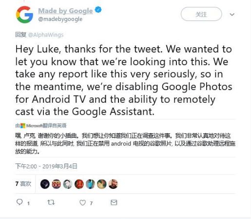 Google 發(fā)言人在回復媒體的信函中表示:“我們非常重視用戶(hù)的隱私。在我們調查這個(gè) BUG 期間,我們已經(jīng)禁用了在 Android TV 上通過(guò) Google Assistant 或者 Google Photos 查看圖片的投屏功能。”