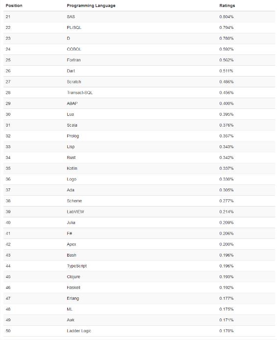 TIOBE 4 月編程語(yǔ)言排行 1-20