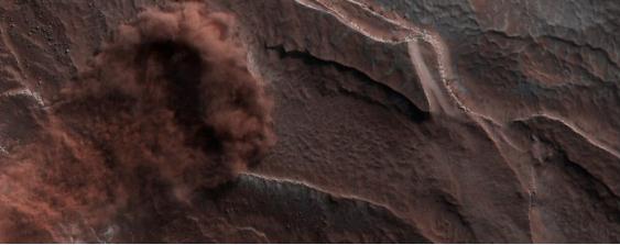 “每年春天,太陽(yáng)照射在火星北極層疊層的一側,其被稱(chēng)為北極層狀沉積物,” 行星科學(xué)家 Candy Hansen 寫(xiě)道。“暖和使冰塊變得不穩定并開(kāi)始松動(dòng)。”