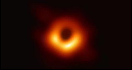 圖像中心是黑洞的剪影,周?chē)h(huán)繞著(zhù)一個(gè)明亮的光子環(huán)。