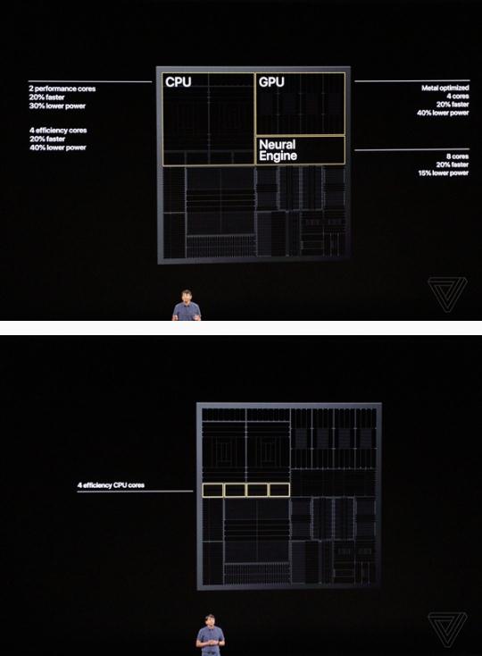 還有八核心神經(jīng)引擎(類(lèi)似 NPU),性能提升 20%,功耗降低 15%,以及機器學(xué)習加速單元,矩陣乘法性能提升 6 倍。