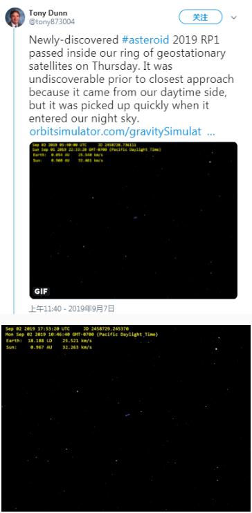 業(yè)余天文學(xué)家 Tony Dunn 在 Twitter 上報道說(shuō),小行星 2019 RP1“在最接近之前是不可發(fā)現的,因為它來(lái)自我們白天的一面,但是當它進(jìn)入我們的夜空時(shí)它被迅速發(fā)現。”