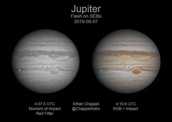 2019 年 8 月 7 日拍攝的木星圖片顯示,木星南半球有明亮的白色瞬態(tài)閃光,這是自 1994 年舒梅克-列維 9 號彗星撞擊太陽(yáng)系最大行星以來(lái)的第七次撞擊