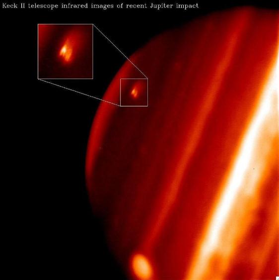 木星撞擊留下了巨大的傷疤,在可見(jiàn)光下可以看到很大的黑點(diǎn),但在紅外線(xiàn)下可以看到亮點(diǎn)