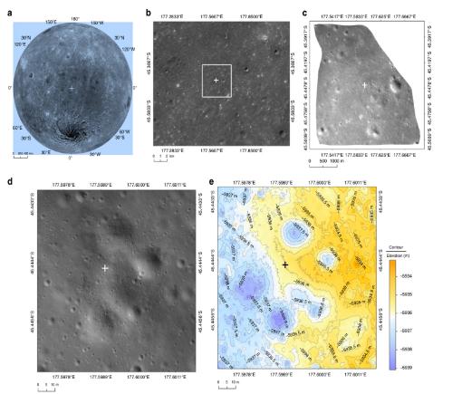 隨后,研究團隊利用由兩臺攝像機組成的導航攝像機(NCAM)獲取的雙目立體圖像,精確計算出“嫦娥四號”的著(zhù)陸點(diǎn)為東經(jīng)177.5991°,南緯45.4446°,高程-5935米。該著(zhù)陸點(diǎn)位于一個(gè)退化撞擊坑的緩坡上,距離北邊一個(gè)直徑25米的撞擊坑邊緣很近,且著(zhù)陸點(diǎn)周?chē)灿形鍌€(gè)撞擊坑。
