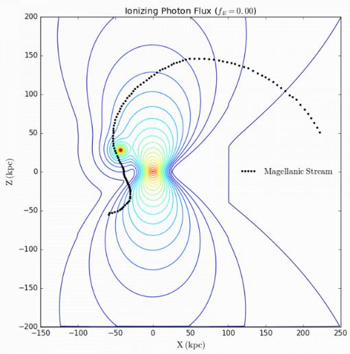 麥哲倫流是小麥哲倫云和大麥哲倫星系留下的氣體痕跡,小麥哲倫云和大麥哲倫星系是繞銀河系運轉的兩個(gè)矮星系。這種非常暴力的行為,讓麥哲倫流散發(fā)出奇怪的輝光,而這種輝光基本上無(wú)法解釋?zhuān)窃谙惹暗难芯恐?,研究人員認為,塞弗特耀斑發(fā)出的紫外線(xiàn)會(huì )導致麥哲倫流中的氫以特定波長(cháng)發(fā)光。