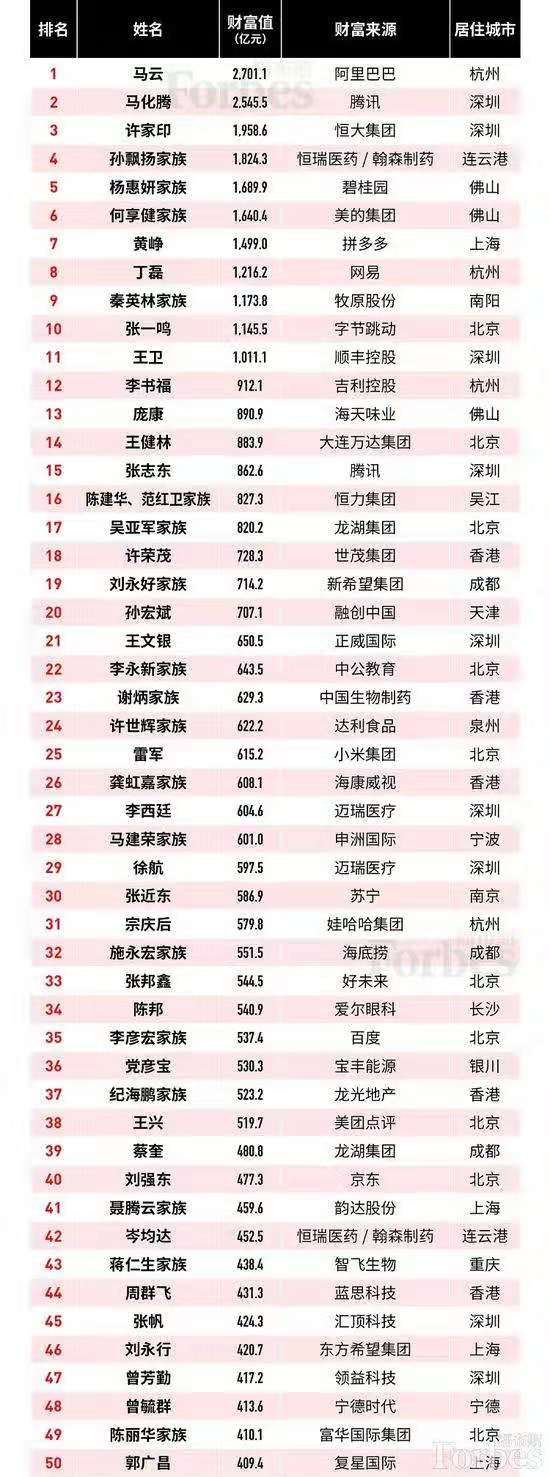 11 月 7 日,福布斯發(fā)布 2019 年度中國富豪榜,400 位中國富豪登上榜單。其中,有 60 位富豪初次上榜。
