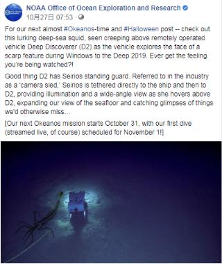 該研究團隊在 Facebook 上寫(xiě)道: “檢查一下潛伏在深海中的烏賊,當遙控潛水器 Deep Discoverer (D2) 在 Windows to the Deep 2019 中探索陡坡特征時(shí),它會(huì )潛入遙控潛水器的上方。是否有一種您被監視的感覺(jué)?!”