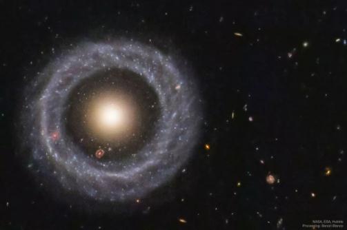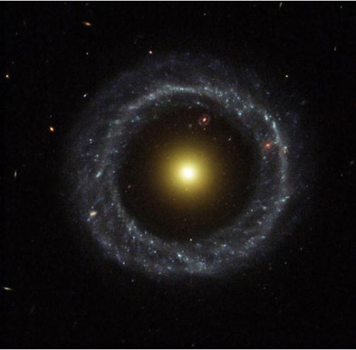 還有其他的環(huán)狀星系,最著(zhù)名的可能是車(chē)輪(Cartwheel)星系,當另一個(gè)更小的星系與它發(fā)生碰撞時(shí),它演變成了現在的狀態(tài)。這可能是大多數環(huán)形星系的形成方式。然而,幾十年來(lái)的觀(guān)察似乎已經(jīng)排除了霍格天體也是這樣形成的可能性。
