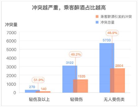 報告顯示,在越嚴重的沖突中,乘客醉酒占比越高。2019 年1-3 季度,有人受輕傷及以上的沖突投訴中,由醉酒引發(fā)的占比 51.9%;有人受輕微刮傷的沖突投訴中,由醉酒引發(fā)的占比 49.2%;言語(yǔ)沖突投訴中,由醉酒引發(fā)的占比 48.9%。