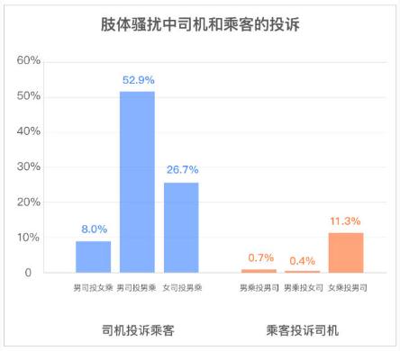 乘客醉酒乘車(chē)也可能導致言語(yǔ)或肢體類(lèi)性騷擾投訴,其中,大部分是言語(yǔ)騷擾投訴,但是在少量的肢體騷擾投訴中,司機投訴乘客占比 87.6%,乘客投訴司機占比 12.4%。值得注意的是,男司機投訴男乘客肢體騷擾的比例占 52.9%。