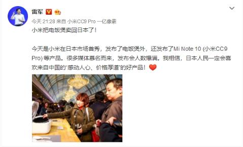 小米董事長(cháng)兼 CEO 雷軍表示:“小米把電飯煲賣(mài)回日本了!……很多媒體慕名而來(lái),發(fā)布會(huì )人數爆滿(mǎn)。我相信,日本人民一定會(huì )喜歡來(lái)自中國的‘感動(dòng)人心、價(jià)格厚道’的好產(chǎn)品!”