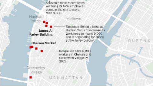 四大科技巨頭——亞馬遜、蘋(píng)果、Facebook 和谷歌——已經(jīng)在哈德遜河沿岸,從市中心到曼哈頓下城設立了大型辦公區,或者在最近幾個(gè)月一直在尋找新的寫(xiě)字樓,經(jīng)常為了同一個(gè)辦公場(chǎng)地相互競爭。