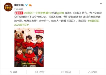 1月24日消息,作為撤檔電影之一的《囧媽》官微宣布,《囧媽》將在大年初一上線(xiàn)免費播出,其表示感謝導演徐崢及《囧媽》片方所做出得這個(gè)決定。“最適合家庭團建的電影,免費在家看!大年初一,和家人一起看《囧媽》”。