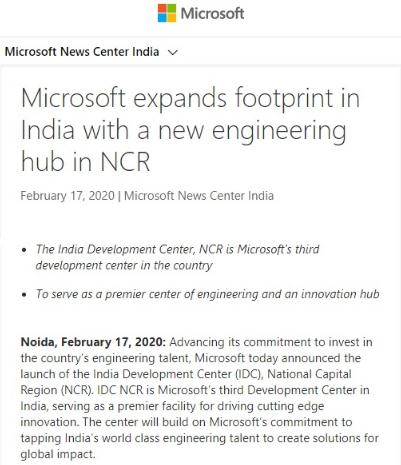 1998 年,微軟在海得拉巴成立了繼雷德蒙德總部外最大的研發(fā)中心之一(IDC),推動(dòng)了該公司的全球共享開(kāi)發(fā)戰略、以及構建產(chǎn)品和服務(wù)。