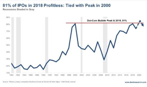 2018 年未盈利就上市的科技公司比例已經(jīng)達到 2000 年互聯(lián)網(wǎng)泡沫時(shí)期水平