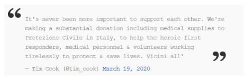 “相互支持從來(lái)沒(méi)有像現在這樣重要。我們正準備向意大利的公民組織 Protezione Ciile 提供包括醫療用品在內的大量捐贈,以幫助英勇的急救人員、醫務(wù)人員和志愿者不知疲倦地保護和拯救生命。”庫克在 2020 年 3 月 19 日發(fā)推文稱(chēng)。