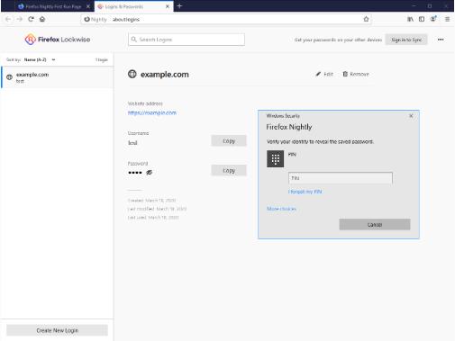 目前該功能已在 Firefox 76 Nightly 版本中可用。Firefox 會(huì )彈出一個(gè)要求輸入 Windows 密碼或 PIN 碼的對話(huà)框,諸如顯示密碼、復制密碼或編輯密碼之類(lèi)的請求都會(huì )產(chǎn)生提示。