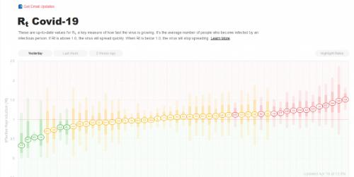 其中“Rt”衡量的是被傳染者感染的平均人數。數字 1 以上越高,表示 COVID-19 在人群中的傳播速度越快,而低于 1 的數字則表示病毒正在消退。例如,Rt.live 顯示,佐治亞州的 Rt 得分最高,最危險的 Rt 得分為 1.5,而紐約由于積極的社交隔離令,下降到了 0.54。