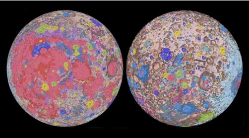 月球表面的“麻子”標記就像記錄了月球的歷史,新地圖用醒目的顏色記錄了月球的過(guò)去,區分了不同的地質(zhì)構造和時(shí)間段。這張地圖以大約 35 億年前的 Imbrian 時(shí)代的粉紅色為主。在那段時(shí)間里,月球被小行星撞擊,形成了許多我們今天在月球表面看到的撞擊坑。