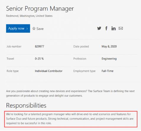 在全力以赴推動(dòng)雙屏手機 Surface Duo 今年上市的同時(shí),最新招聘信息顯示微軟已經(jīng)開(kāi)始籌備下一代產(chǎn)品的開(kāi)發(fā)事宜。在招聘信息中寫(xiě)道:“我們正在尋找一位優(yōu)秀的項目經(jīng)理,他將推動(dòng) Surface Duo 和未來(lái)產(chǎn)品的端到端應用場(chǎng)景和功能的開(kāi)發(fā)。要想成功擔任此職位,需要具備較強的技術(shù)、溝通和項目管理能力。”