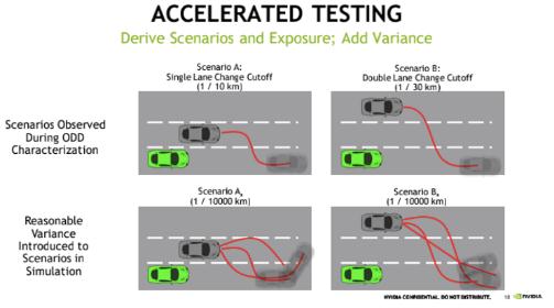 所以,我們可以把上述步驟分為兩大類(lèi),即真實(shí)世界的測試里程,以及仿真環(huán)境里加速測試里程。這里的“加速”不僅是指時(shí)間上的加速,還包括了場(chǎng)景構建,或是其他變化的加速,從而獲得更高質(zhì)量的驗證里程數。