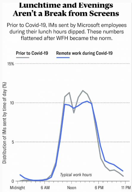 在家工作意味著(zhù)經(jīng)理們與員工之間的交流越來(lái)越多。他們發(fā)送的即時(shí)消息增加了 115%,相比之下,針對個(gè)人的電子郵件則多發(fā)了 50%。此外,下午的會(huì )議已經(jīng)取代了早上的會(huì )議,午餐時(shí)間的即時(shí)消息減少了 10%,而在疫情之前,午餐時(shí)間的即時(shí)消息占比 25%。隨著(zhù)人們努力趕工,出現了一種新的 "夜班 "模式,下午 6 點(diǎn)到午夜之間發(fā)送的午即時(shí)消息量增加了 52%。研究還顯示,以前周末工作時(shí)間最少的人,其工作量是平時(shí)的三倍。