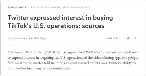 美國總統特朗普以所謂“國家安全”為由下令封殺 TikTok 后,微軟正積極行動(dòng)將其納入旗下,而華爾街日報、路透社 9 日先后援引消息人士爆料,社交媒體巨頭推特(Twitter)也瞄向 TikTok,有意合并其業(yè)務(wù)。