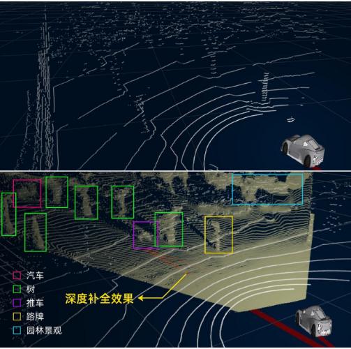 △上圖為低線(xiàn)束 LiDAR 原始點(diǎn)云,下圖為經(jīng)達摩院算法深度補全后的點(diǎn)云,LiDAR 線(xiàn)束量提升了 3 倍以上,且自動(dòng)駕駛車(chē)輛更好辨別出了障礙物。