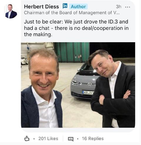 不過(guò),關(guān)于雙方本次會(huì )面的細節并未流出,但有媒體猜測,雙方的會(huì )面旨在建立更深的合作關(guān)系。針對外界的猜測,大眾集團 CEO Herbert Diess 已在社交媒體 Linkedin 發(fā)布帖子澄清。他說(shuō)道: